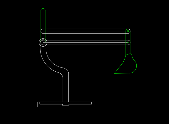 The next step involves fine-tuning the arm geometry to achieve the desired lever action. I begin determining the degree of motion of the shovel that I wanted to see against the rotation base. As the position of the shovel is adjusted, I then determine where the levers should be angled. As shown, the levers will be pointing up perpendicularly from the ground when the arms are positioned parallel with the ground.