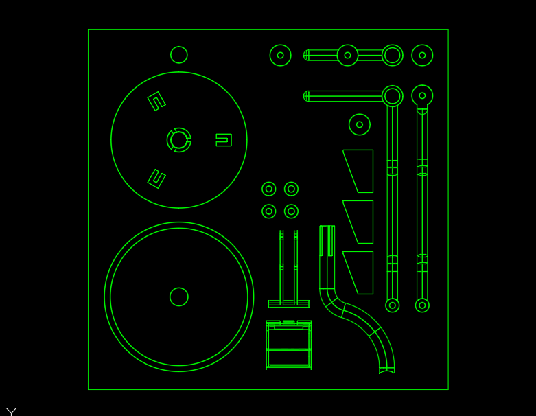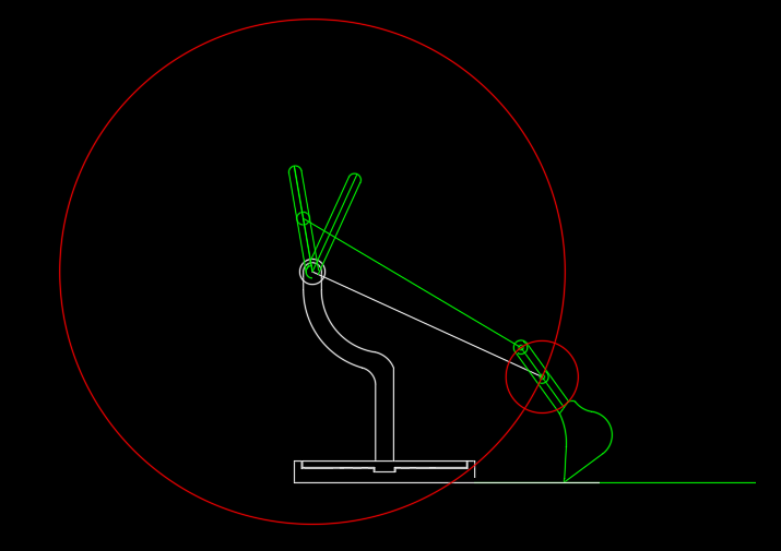 A circle is drawn at each movement point to show the full range of motion for each components connection. This helps illustrate how all the moving parts work together. Now, we can see how the shovel will act based on the inputs provided by the levers. From here, the lengths of all parts and point locations are adjusted until the geometry allow for the best operation.