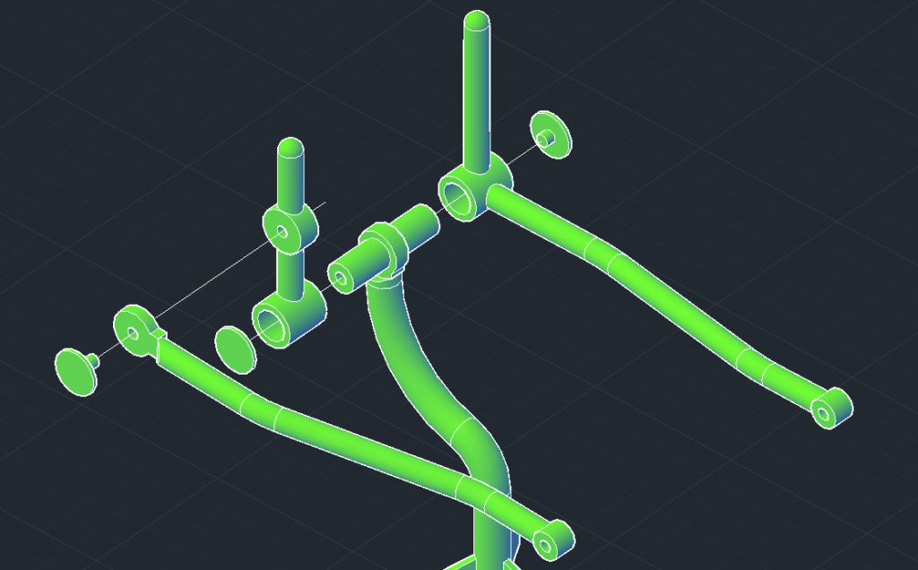The photos above present the more complicated features of the arm geometry. To further illustrate this design, a plan view reveals additional details of the arm geometry. The levers are positioned side by side for smooth operation. The shovel is then positioned in between the levers and centered with the excavator rotation rod/swivel post. Joining the levers to the hinge points on the shovel requires a bend in each arm to meet at the shovels center. Now, moving forward with this concept brings considerations on how the arms will be connected to the shovel. We will go into more detail in the next section.